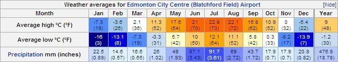 L'année 2006 fut particulièrement chaude à Edmonton, avec des maximales de 29°C ou plus, plus de 20 fois dans l'année, entre mi-mai et mi-septembre. Typiquement, cependant, l'été dure de fin juin à fin août, et l'humidité est rarement insupportable. Les hivers durent de novembre à mars, et varient beaucoup en longueur et en intensité, n'ayant pas les chinooks du sud de l'Alberta. Le printemps et l'automne sont tous deux courts et très variables. Edmonton compte une moyenne de 140 jours de gel par an.