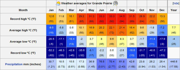 Grande Prairie a un climat continental nordique typique de l'Alberta et du nord de la Colombie-Britannique. Les hivers sont généralement froids avec quelques périodes de douceur. Les étés sont souvent assez frais à agréablement chaud dans la journée, mais les nuits peuvent être fraîches, malgré les longues journées d'été typiques pour cette latitude. Les jours à plus de 30°C sont rares, survenant en moyenne seulement un ou deux jours par an, ce qui n'est pas inattendu dans ce grand nord. Les conditions hivernales peuvent varier énormément d'année en année. Les hivers sont connus pour être assez doux pour produire les conditions d'un "brun de Noël" (périodes où la neige fondant produit de la boue), où peu ou pas de neige mai jusqu'à l'automne après Noël en raison de début d'hiver exceptionnellement doux conditions.