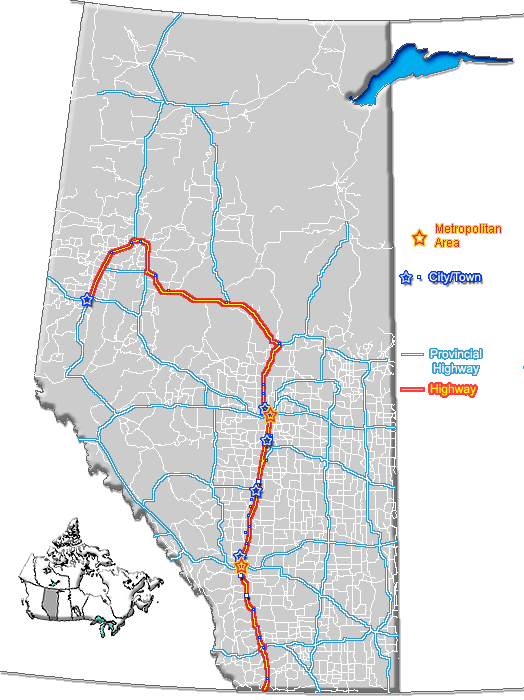 Red Deer est aussi majoritairement évitée, via un important virage vers l'ouest à l'entrée de la ville. Gasoline Alley, située à la limite sud de la ville, est ainsi un arrêt populaire pour les voyageurs de Calgary et Edmonton arrivant à mi-chemin, avec de nombreuses stations-services et restaurants. Vers le nord, l'autoroute évite encore de plus petites communautés, vers l'ouest cette fois. Leduc, au sud d'Edmonton, est divisée de la même manière que l'est Airdrie (mais sans murs anti-bruits) ; cependant, cette situation est survenue du fait du boom immobilier de l'ouest de la ville. L'autoroute passe aussi immédiatement à l'est de l'Edmonton International Airport, à 15 km au sud de la ville.